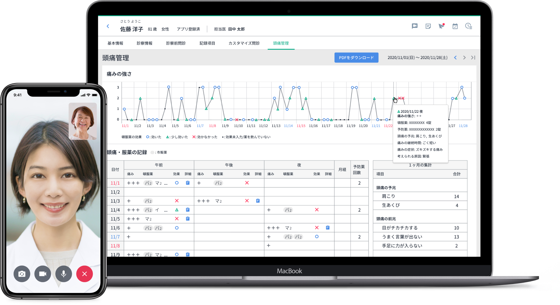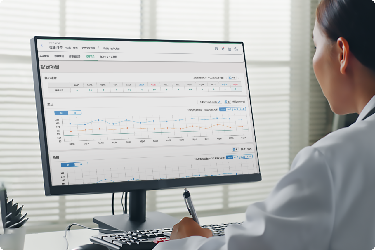 知りたい項目を事前にカスタマイズすると、患者は「かかりつけ医の決めた任意の日時」にスマートフォンアプリで記録ができます。今まで詳しく見えなかった日常の変化を可視化によって診療の質を高め、予防医療にも貢献します。